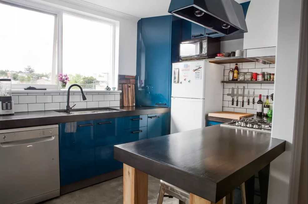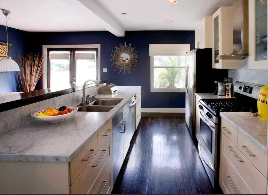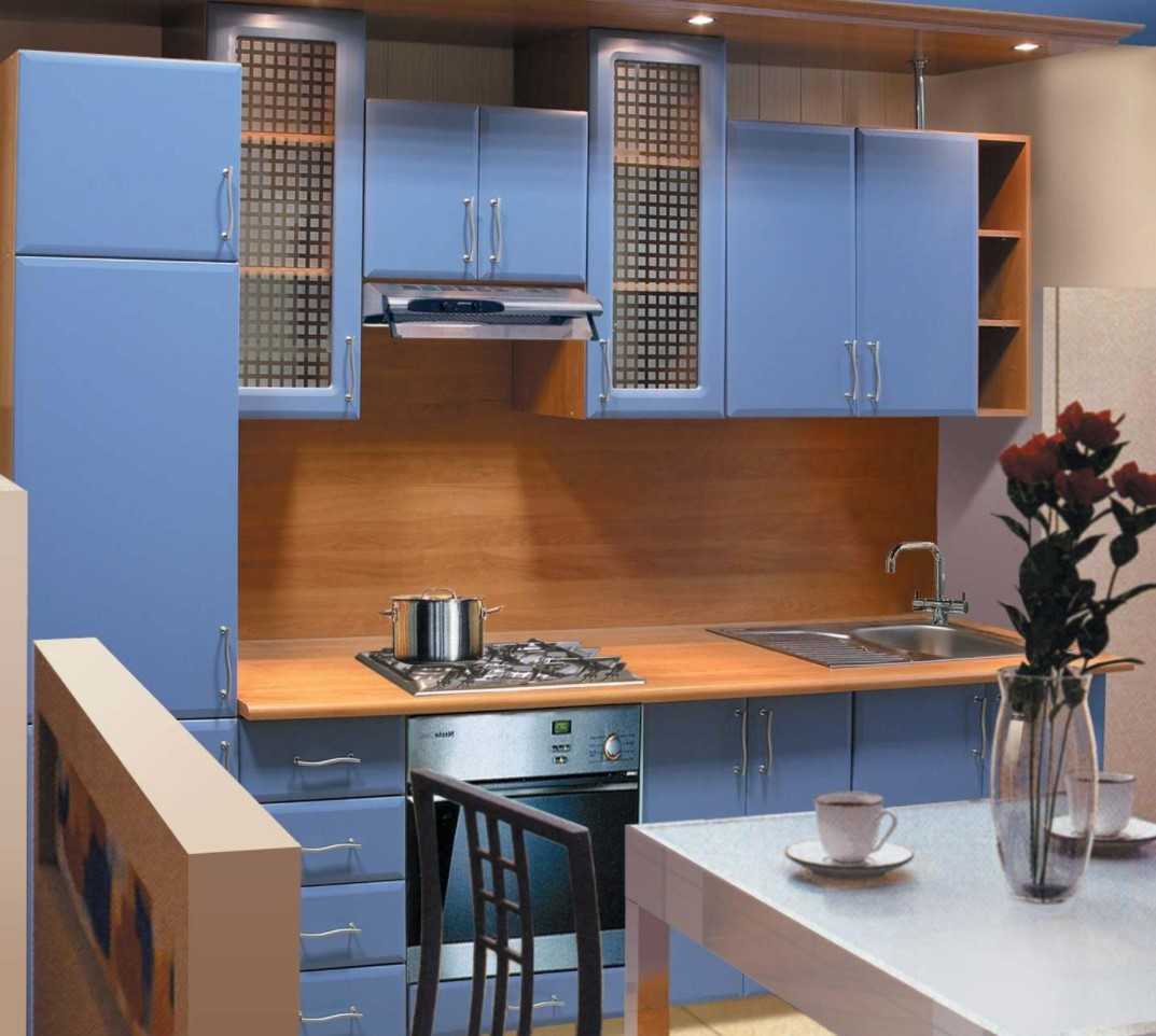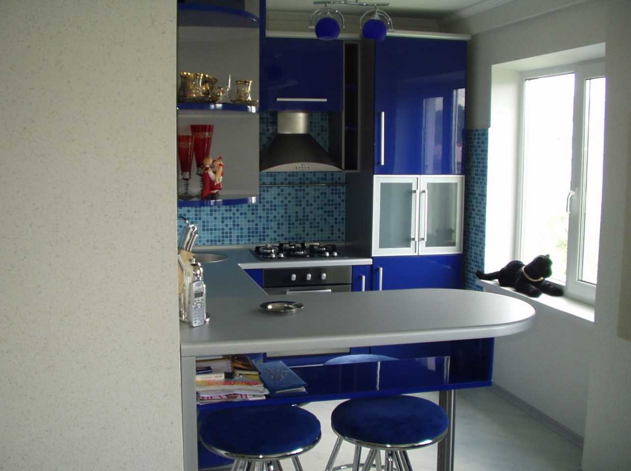 - если полезной площади мало, используйте светлые варианты синевы в качестве фона (стены, потолок, фартук);