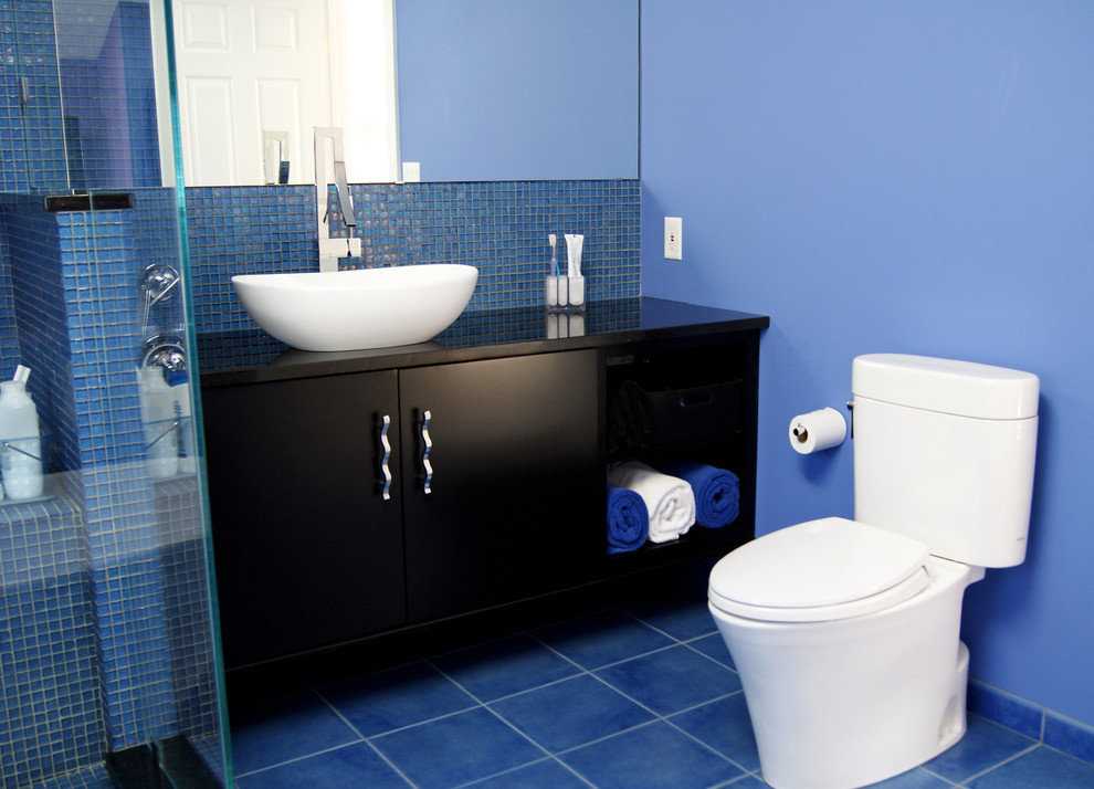 Не стоит игнорировать сочетание синих оттенков между собой. Для ванной комнаты можно подобрать 2 или 3 оттенка синего цвета, которые будут контрастировать между собой.