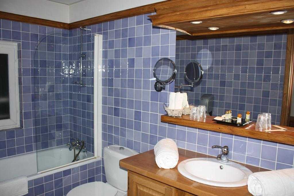 Полы лучше всего сделать деревянными, либо выложить кафелем с аналогичной текстурой. Красиво смотрится ванная с синим полом из узорчатой метлахской плитки (ею можно облицевать и стены). Ещё одно интересное решение – мозаика, позволяющая создавать покрытия с рисунком.