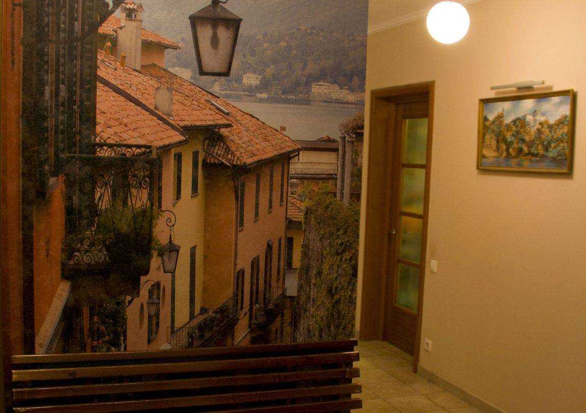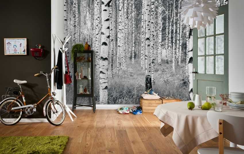 В коридоре лучше украсить стены с графическим изображением – это увеличит пространство компактного помещения. Прекрасный вариант – оформить дверной проем дорогой, уходящей вдаль.