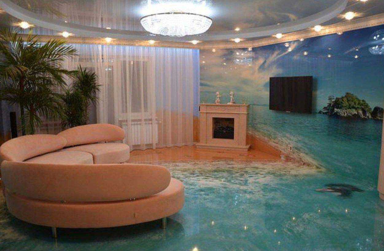 Для создания «вау-эффекта» часто комбинируют с трехмерными обоями потолки и полы. В итоге создается впечатление, будто в комнате нет границ. Но сделать подобное самостоятельно у вас вряд ли получится – это под силу только настоящим мастерам своего дела.