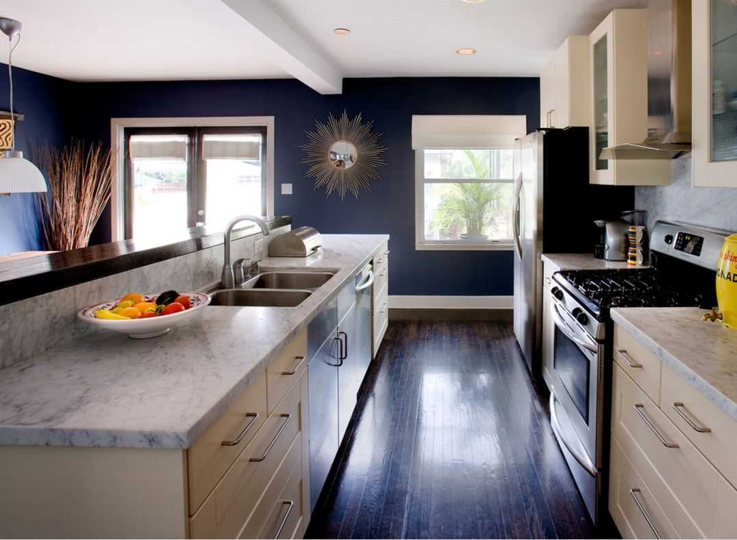 Темные синие обои на кухне можно разбавить светлым кухонным гарнитуром и белыми потолками