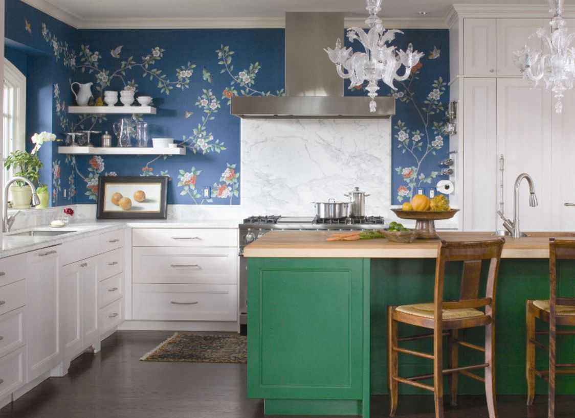 Обои для синей кухни уместны, красивы, а также практичны, на них не видны потеки или разводы. Их можно выбирать в любых вариациях с любыми изображениями и комбинировать с чем угодно – от мебели стиля хай-тек до провинциально милых, белых деревянных шкафчиков и лавочек.