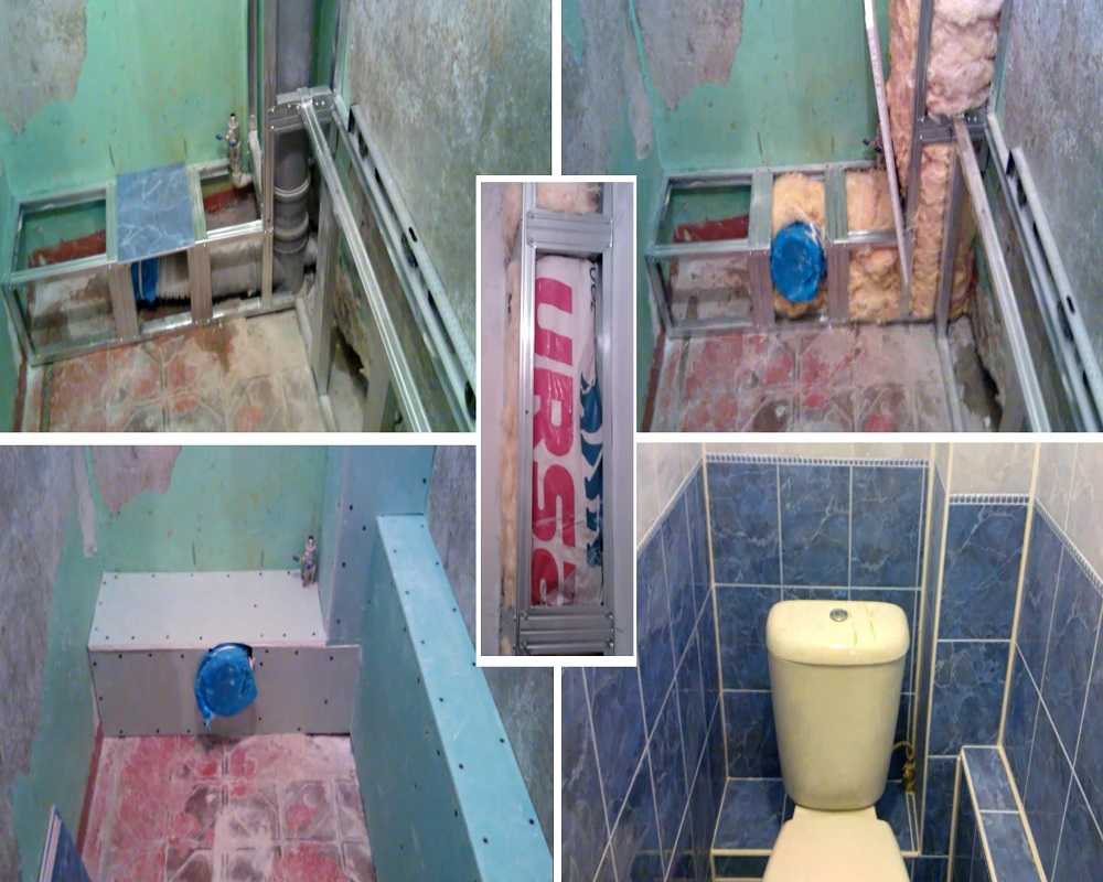 Трубы в туалете можно спрятать сделав над ними каркас к которому прикручивается влагостойкий гипсокартон, а к гипсокартону легко приклеивается кафельная плитка. Но при этом нужно обязательно делать открывающиеся люки через которые можно будет посмотреть состояние стыков труб и показания со счётчиков. Все стены тщательно обрабатывают грунтовкой. Плиточный клей разводят водой согласно приложенной к нему инструкции, причём в разведённом клее не должно оставаться комочков. Примерно через 10 минут после приготовления клея его наносят с помощью зубчатого шпателя на поверхность стены чтобы можно было сразу положить 3 или 4 плитки. Укладка плитки в туалете производится рядами, а первый ряд начинают снизу.