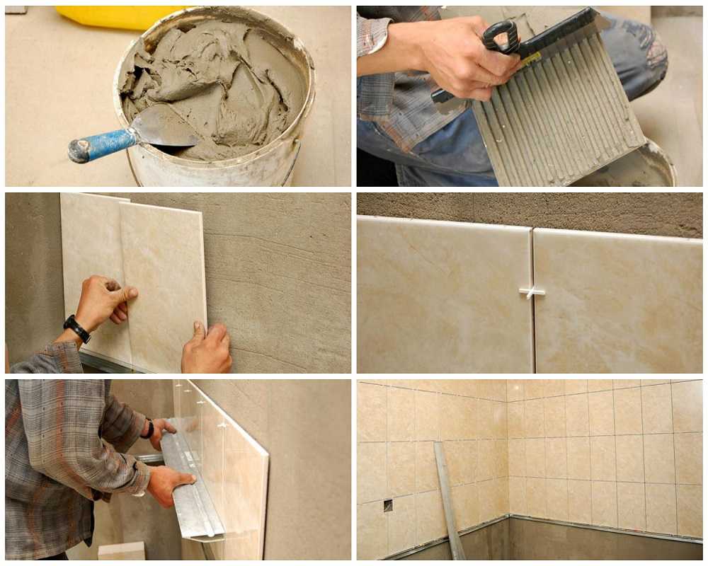 На каждую укладываемую плитку намазывается очень тонкий слой клея и плотно прикладывается к стене. Между соседними плитками втыкают пластмассовые крестики чтобы стыки между плитками были одинаковой ширины. Уложив несколько плиток нужно проверять их уровнем по вертикали и швы по горизонтали. Уложив два ряда плиток необходимо выждать какое-то время чтобы клей схватился. Когда все плитки будут уложены нужно будет выждать одни сутки и затем вытащить все крестики и очистить швы между плиток от клея. В небольшой посуде разводят водой затирку и заполняют её швы выравнивая их резиновым шпателем. Через 4 часа плитку на стенах можно будет почистить губкой.