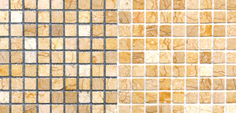 - При использовании разноцветной или двухцветной плиточной отделки и мозаики, для затирки следует подбирать цвет, приближенный к более светлому тону, применяемому в оформлении или бесцветную фугу.