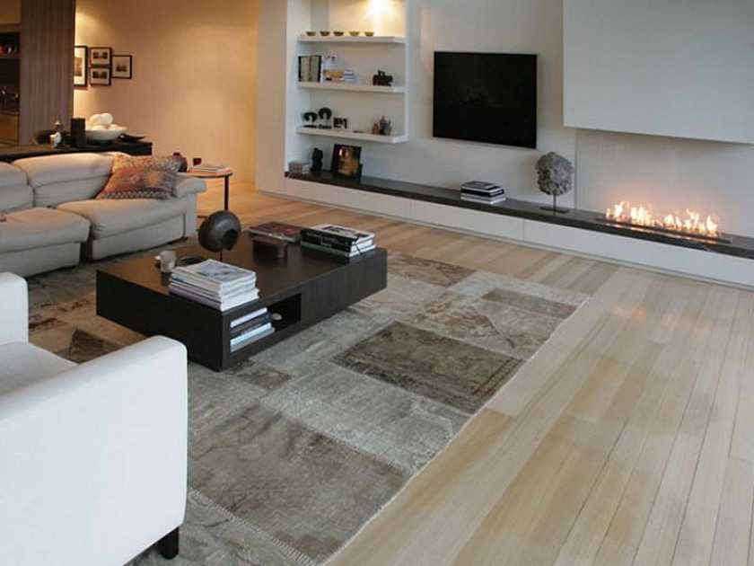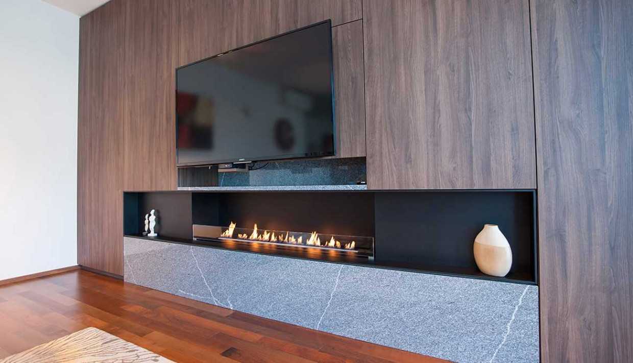Оформить гостиную, кухню, обеденный зал в гостинице или кафе можно изделием небольшой мощности, встраиваемым в корпусную мебель. Решение позволит немного обогреть комнату, изменить облик интерьера в лучшую сторону, иногда до неузнаваемости, и сберечь пространство. Если размеры помещения сравнительно небольшие, оптимальный вариант ─ угловая конструкция.
