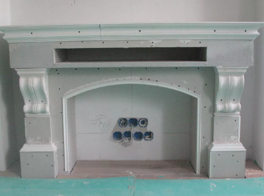Скрыть недостатки можно шпаклевкой. Также можно заранее приобрести декоративные элементы из полиуретана, чтобы придать камину красивые архитектурные формы. Также можно вырезать простые формы из пенопласта и наклеить их на камин.