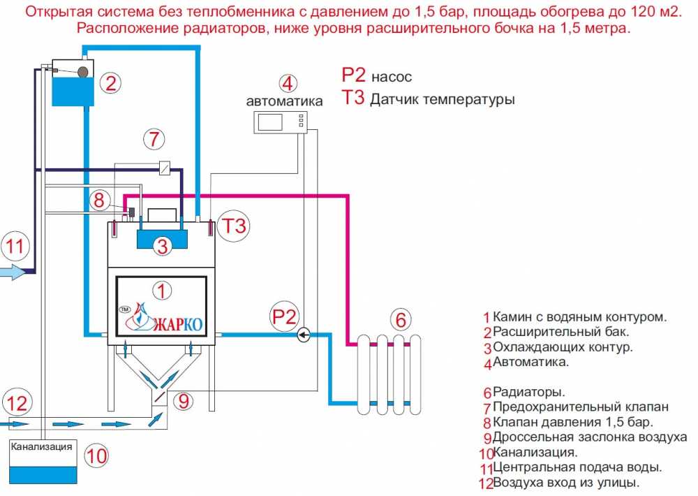 Аквакамин стыкуется как с открытой, так и с закрытой системой отопления. Для магистрали выбирают трубу минимум 1,5 дюйма. Ее монтируют с постоянным уклоном минимум 5 градусов. Радиаторы подключаются отводами 1/2—3/4 дюйма.