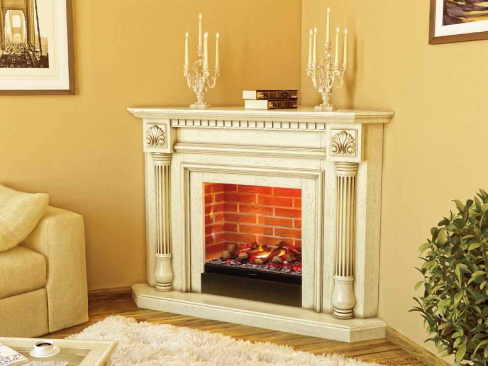 Угловой декоративный очаг идеально подходит для комнат с небольшой площадью, поскольку занимает мало места.