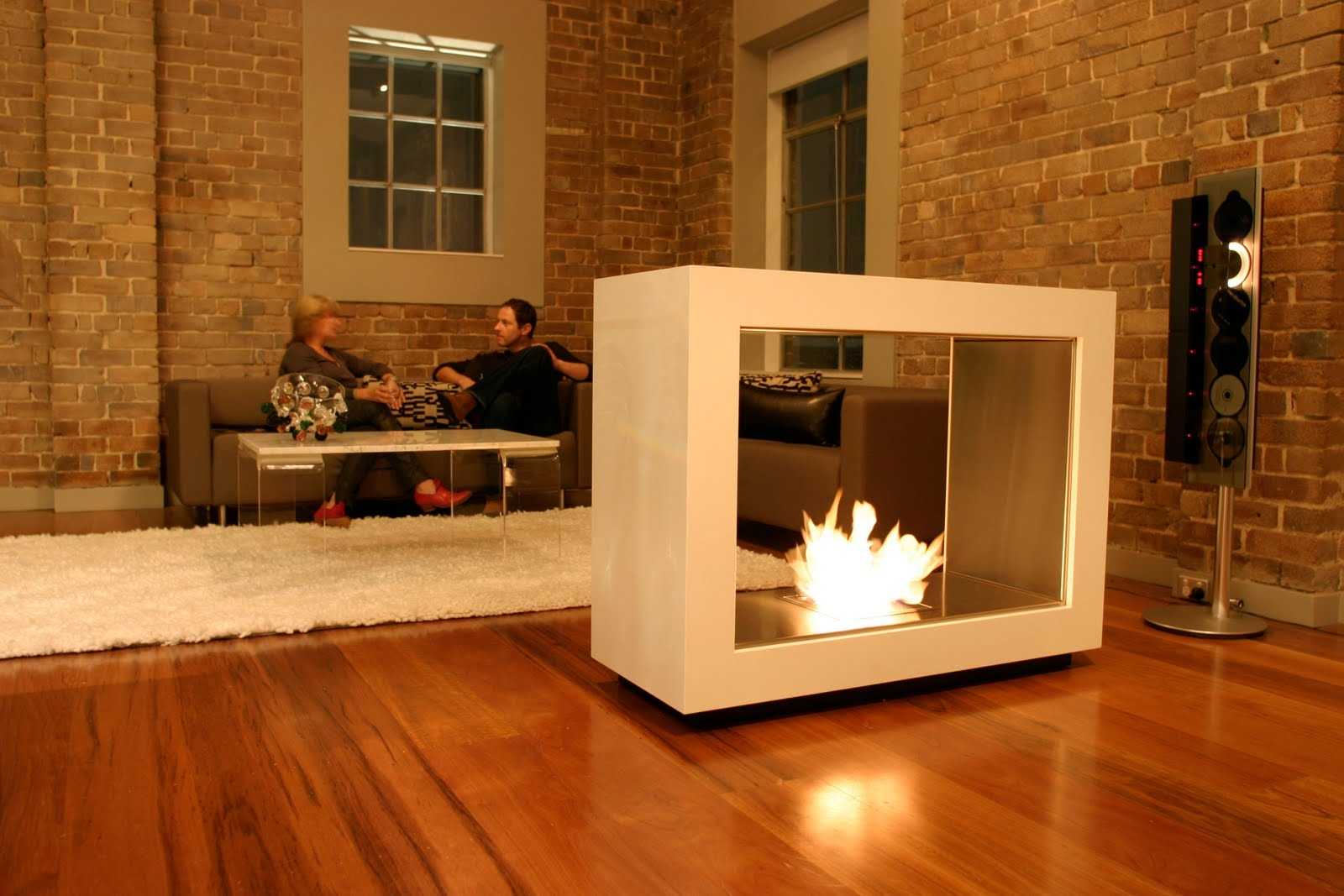 Данный вариант выполняется крайне редко – для его установки потребуется много места, примерно в середине комнаты. Это подходящая идея для просторных квартир-студий, совмещенных пространств. Фальш-камин служит здесь для зонирования территории.