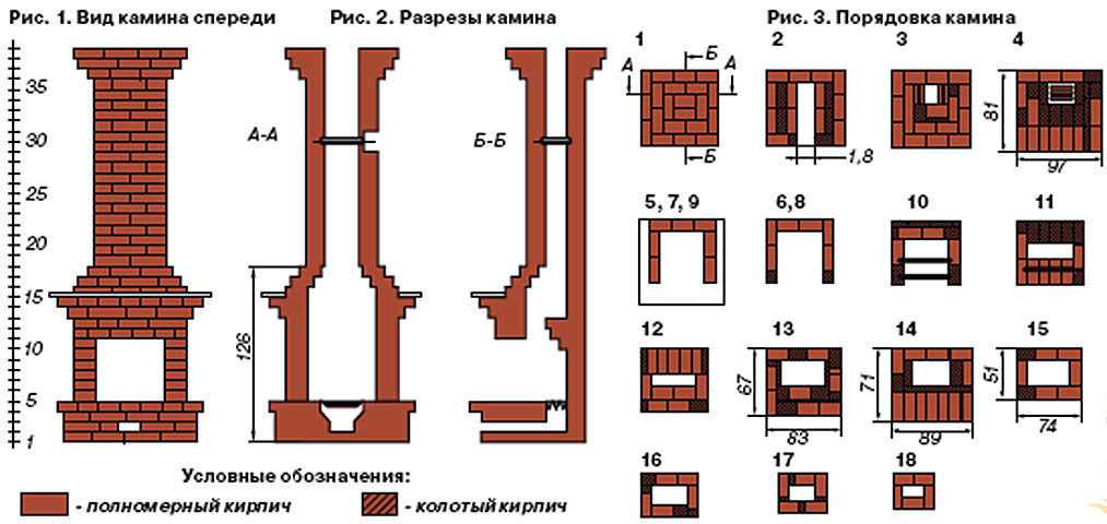 Красный керамический кирпич перед кладкой кратковременно замачивают в воде, огнеупорный же кирпич мочить нельзя, с его поверхности стирают влажной тряпкой пыль и загрязнения. Эта мера способствует более равномерному просыханию кладочного раствора. Порядовка камина из кирпича с пояснениями представлена на рисунках.