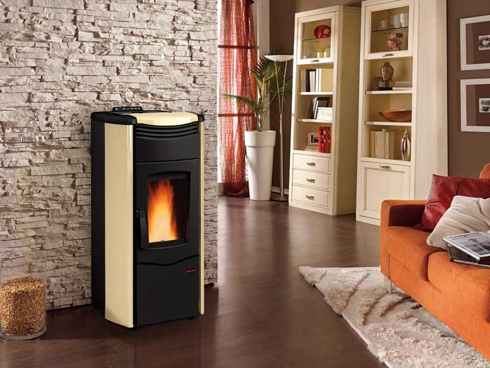 Камин с водным контуром на древесном топливе имеет низкий КПД, не превышающий 60%. Кроме того, простые модели для эффективного снабжения дома теплом нуждаются в постоянном подкладывании дров. От этих проблем избавлены пеллетные камины. Они используют в качестве топлива гранулы, которые имеют большую удельную теплоту сгорания, чем дрова. Пеллет автоматически загружается с задней стороны топки. Регулировать интенсивность подачи и, следовательно, мощность работы камина можно с помощью электрического пульта управления.
