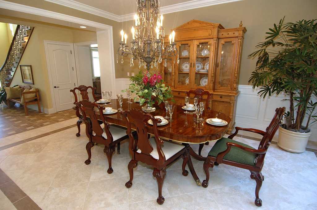 В столовой гармонично разместится шкаф-буфет со стеклянными дверцами, в него можно выставить керамическую и глиняную посуду.