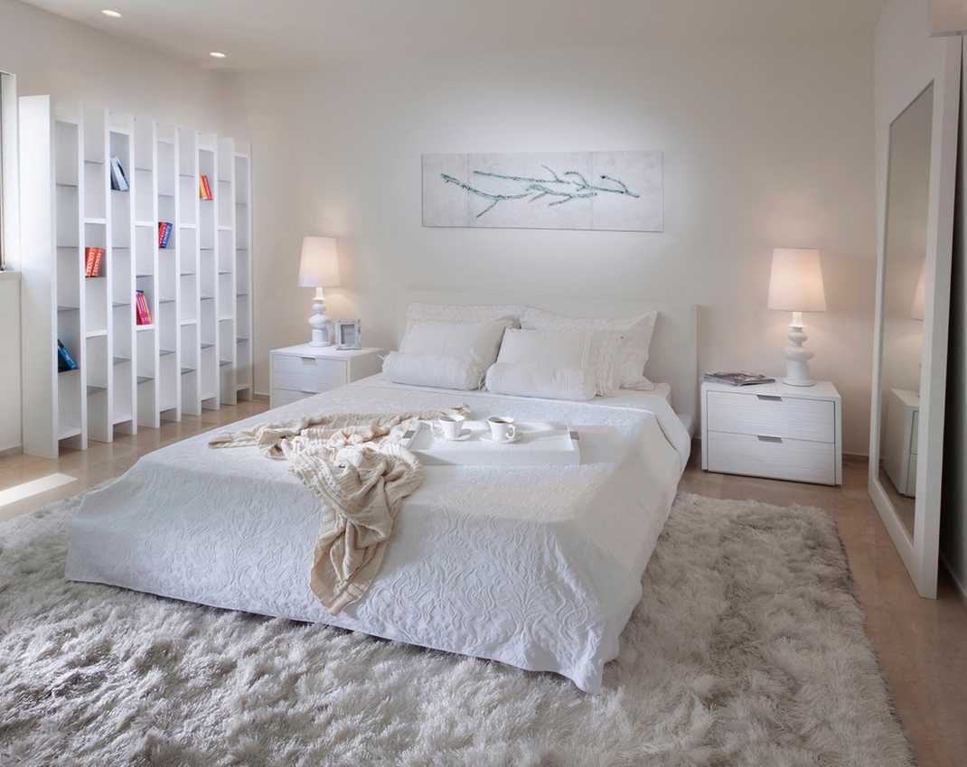 В спальню на пол выбирайте ковры из шелка, шерсти. Размер рассчитывайте так, чтобы утром, когда будете вставать, ваши ноги попали на приятный ворс. Это может быть один большой ковер, частично заходящий под кровать. Или же два, расположенные по обе стороны от спального места. Подробнее о современном дизайне спален читайте здесь.