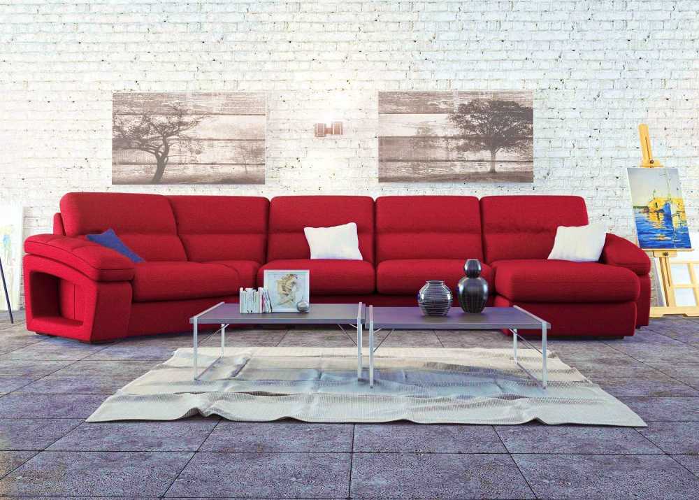 В просторном зале будет неуместно смотреться миниатюрный красный диван. Комнату может оформлять классический диван-книжка в компании с двумя креслами одного или разного цвета. Так же в гостиной гармонично смотрится угловая или модульная модель, в зависимости от планировки он может занимать место в углу или в центре комнаты.