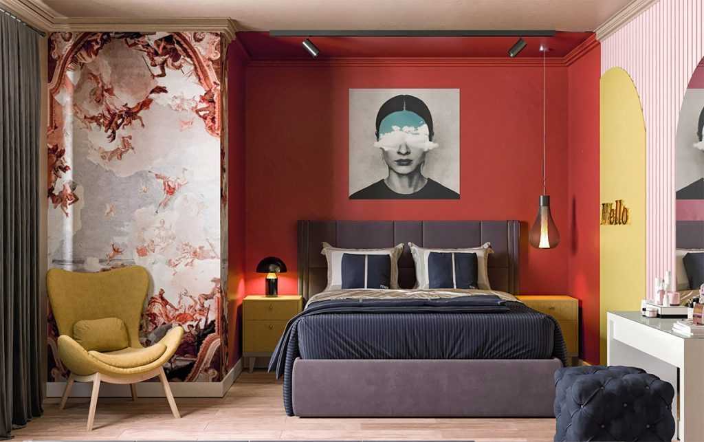 При выборе красного для отделки комнаты лучше не сочетать красные стены и потолок одновременно.
