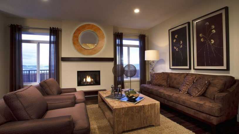 Разрабатывая дизайнерский проект для узкой гостиной с камином в квартире, следует проявить внимательность и не перегружать помещение лишними предметами мебели. Оформляя каминную зону, следует обеспечить безопасное расстояние мягкой мебели и ковров до открытого огня. Оно не должно быть меньше полутора метров.