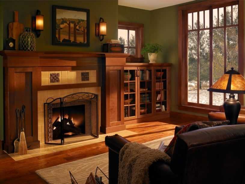 Данный стиль практически не встречается в уютных, небольших квартирах. Его преимущественно выбирают обладатели больших загородных домов. В них естественно предусмотрен массивный классический камин. Кстати в случае, если он выложен из камня, не стоит рассчитывать на ровные, гладкие линии. Что касается интерьера в целом, то гостиная должна быть оформлена со вкусом. Различные трофеи с охоты и оружие – самые распространенные декоративные детали подобных помещений.