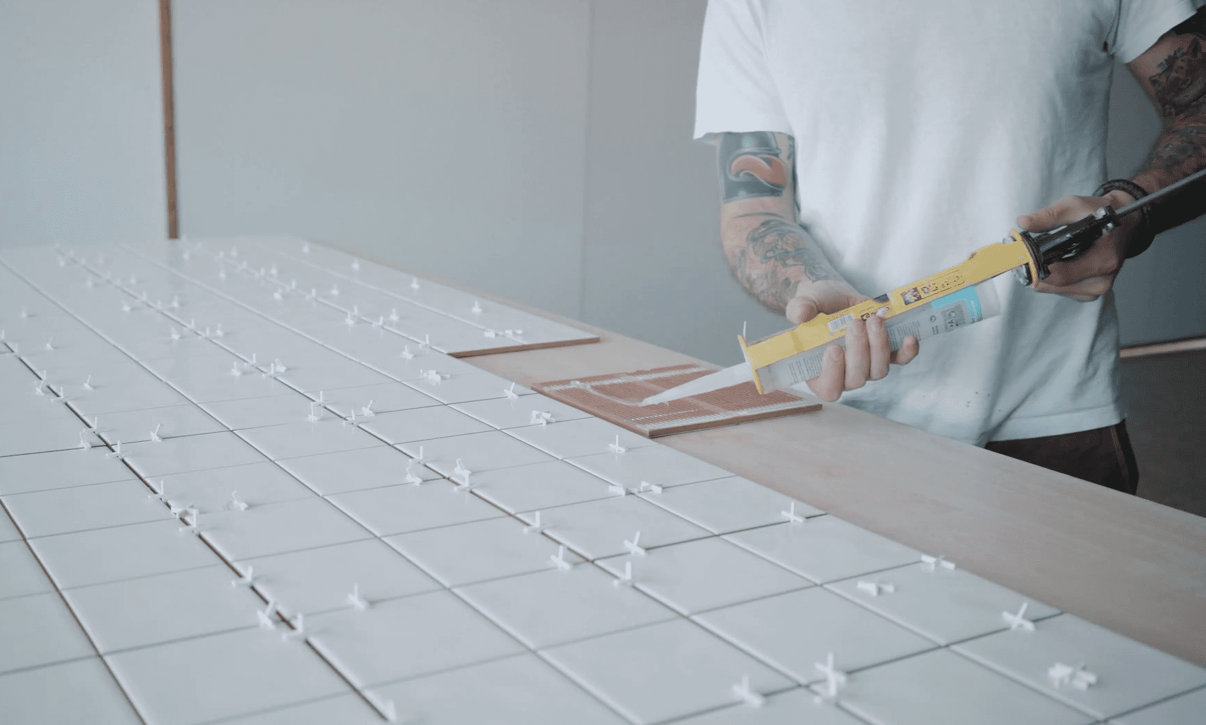 Пластичный акриловый клей – оптимальный вариант для облицовки «теплого пола». Повышенная адгезия обеспечивает долговечное сцепление с деформирующимися поверхностями – плиты ДСП и ОСБ, фанера. Поверхность основания должна быть чистой и сухой. Перед укладкой плитки выполняется грунтовка.