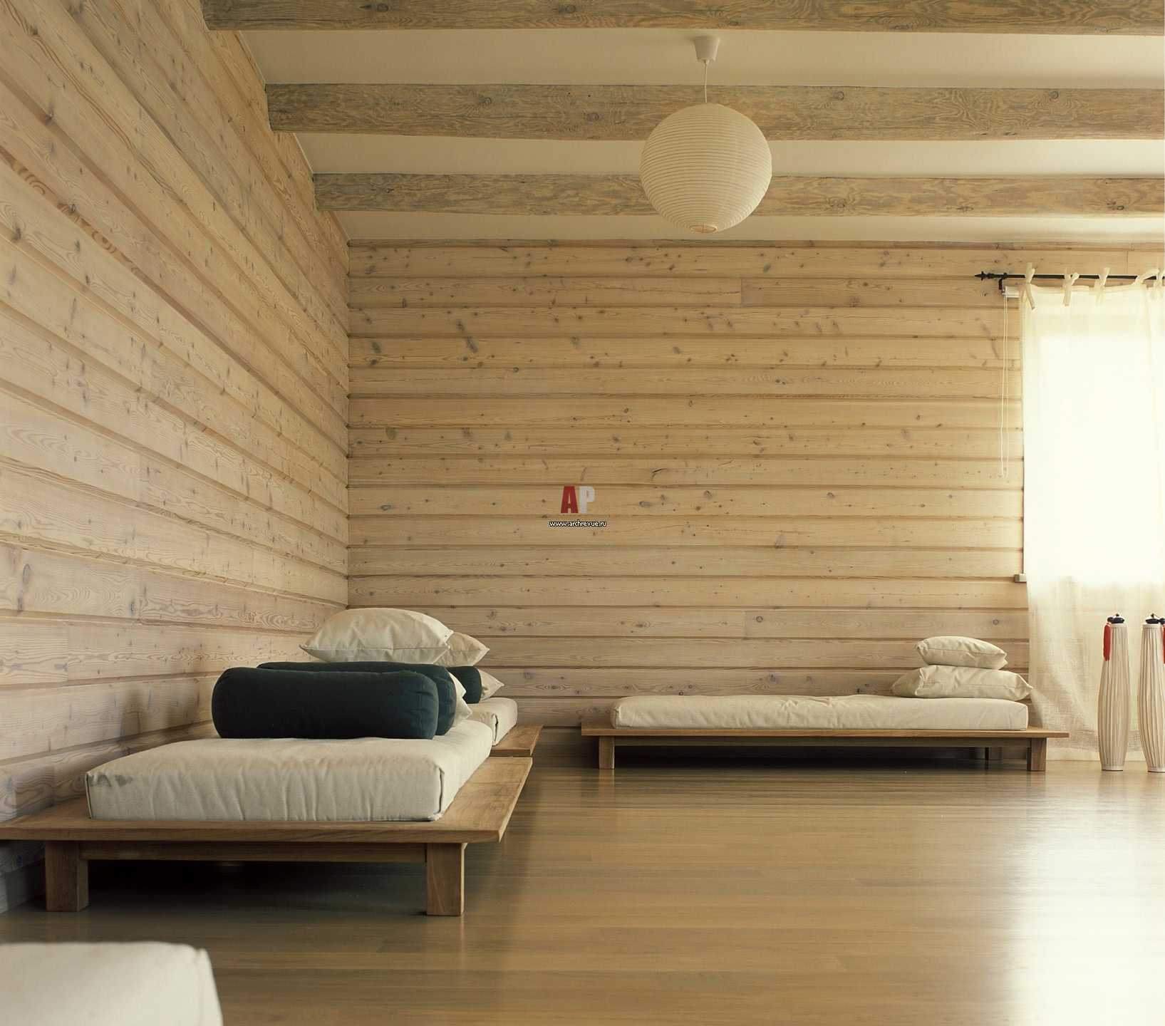 Внутри дома интерьер также выполняется при помощи вагонки различной длины. При помощи пиломатериала обшиваются стены и потолок.