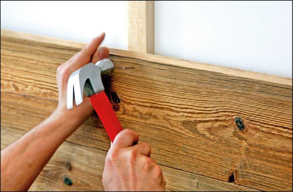 После установки каркаса к нему крепят угловую доску в любом углу. Для этого можно использовать гвозди длиной в 2–3 раза больше толщины доски (для евровагонки оптимальная длина гвоздей составляет 30 мм). Гвозди нужно вбивать так, чтобы они не портили внешний вид обшивки. Если после установки всех досок углы комнат будут закрыты специальными накладками, то шляпки гвоздей можно не обрезать. Если же такие накладки не предусмотрены, то необходимо срезать шляпки, а гвозди вбить в гребень под небольшим углом. До уровня наружной поверхности доски гвозди можно забивать молотком, после чего использовать специальный добойник, который позволит сохранить декоративную поверхность от повреждений.