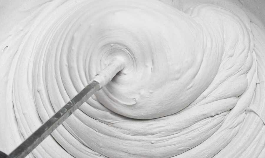 - Добавление воды. Жидкость нужно подливать небольшими порциями, постоянно перемешивая ее миксером. В конечно итоге должна получиться однородная смесь, консистенция которой будет напоминать густую сметану. Для машинной штукатурки состав должен быть более жидким. Затем емкость оставляют на 10-15 минут и снова перемешивают.