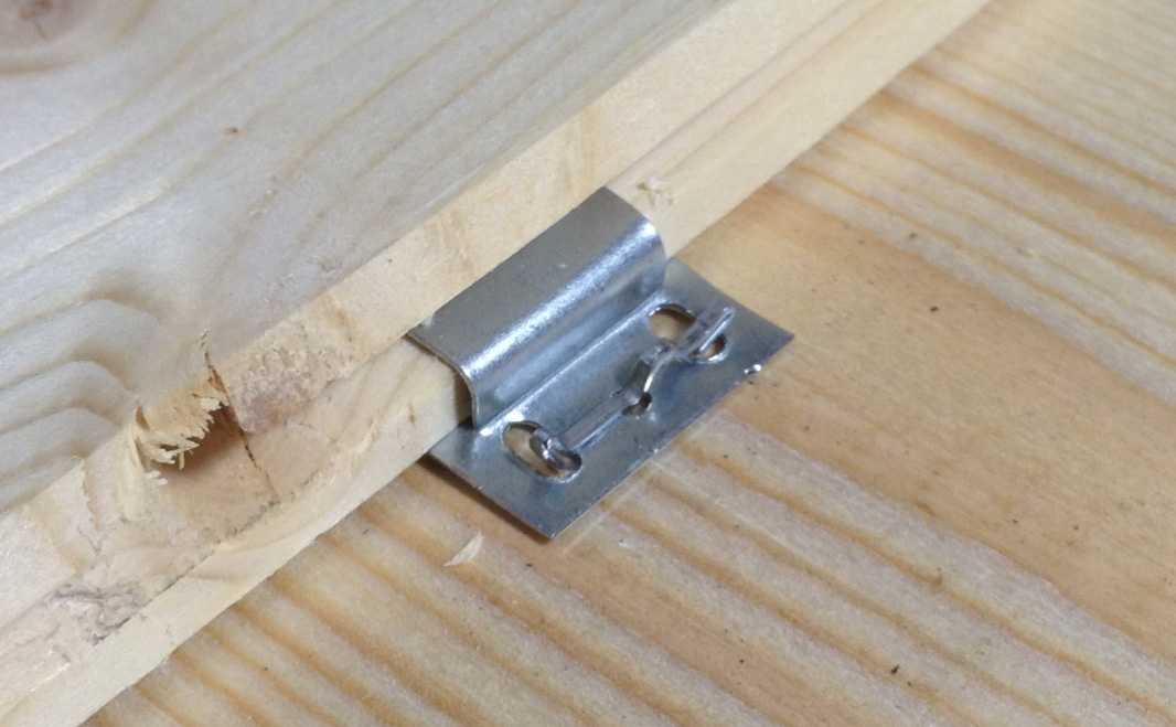 Скобы загоняют в паз под углом. Таким же способом можно крепить кляймеры, размеры метиза должны соответствовать расстоянию между отверстиями в пластинке.