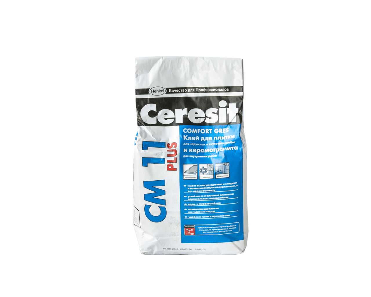 Клей Ceresit СМ 11 Plus для крепления керамической плитки для внутренних и наружных работ и для керамогранита для внутренних работ.Свойства:— водостойкий- морозостойкий- устойчив к сползанию плитки- пригоден для крепления керамогранитной плитки на полах без подогрева внутри зданий- пригоден для внутренних и наружных работ- экологически безопасен.Область применения:Клей СМ 11 Plus предназначен для крепления керамических и каменных плиток с водопоглощением не менее 3% и размером до 40х40 см на недеформирующихся минеральных основаниях (таких как бетон, цементные стяжки, цементные и цементоизвестковые штукатурки), на стенах и полах внутри и снаружи зданий, включая помещения с постоянной влажностью.Пригоден для крепления керамогранитных плиток с водопоглощением При дополнительном введении эластификатора СС 83 клей СМ 11 Plus может применяться для крепления плиток с любым водопоглощением — керамических, керамогранитных, клинкерных, каменных (кроме мраморных), на таких основаниях и элементах конструкций как:- стяжки с подогревом- цоколи, парапеты, фасады, наружные лестницы, входные группы, балконы, террасы, эксплуатируемые кровли- открытые и большие крытые бассейны- гипсокартон, древесностружечные плиты, плиты OSB и другие деформирующиеся основания- гипсовые и ангидритные основания- старые плиточные облицовки- прочные акриловые малярные покрытия, имеющие хорошую адгезию к основанию- легкий и ячеистый бетон- «молодой» бетон возрастом не менее 1 месяца.Этапы работ:Подготовка основания:Основание должно отвечать требованиям СНиП 3.04.01-87 и обладать достаточной несущей способностью. Очистить основание от пыли, жиров, битума и других веществ, снижающих адгезию клея. Непрочные участки и отслоения следует удалить.Неровности глубиной до 5 мм можно выровнять клеем не менее чем за 1 сутки до крепления плитки. Неровности более 5 мм на стенах рекомендуется выравнивать штукатуркой CT 24 или CT 29, а на полах — подходящей ремонтной или напольной смесью.Приготовление смеси:Для приготовления смеси берут отмеренное количество чистой воды с температурой от +15 до +20 градусов Цельсия или эластификатора CC 83, разбавленного водой в соотношении 2:1. Сухую смесь постепенно добавляют в жидкость при перемешивании, добиваясь получения однородной массы без комков. Перемешивание производят миксером или дрелью с насадкой при скорости вращения 400-800 об/мин. Затем выдерживают технологическую паузу около 5 минут для созревания смеси и перемешивают еще раз.Нанесение раствора:Клей наносят на основание гладким шпателем и профилируют гребенчатую структуру зубчатым шпателем. Размер зубцов выбирают в зависимости от размера плиток (см. инструкцию ниже). Если облицовка будет подвергаться воздействию влаги и мороза, а также в случае керамогранитных и каменных плиток, рекомендуется дополнительно нанести сплошной тонкий слой клея на монтажную поверхность плиток («комбинированный способ крепления»).Плитки не замачивать! Плитку укладывают на клей и прижимают не позднее 15-20 минут после его нанесения, пока клей липнет к рукам. Положение плитки можно корректировать в течение 20-25 минут после укладки.