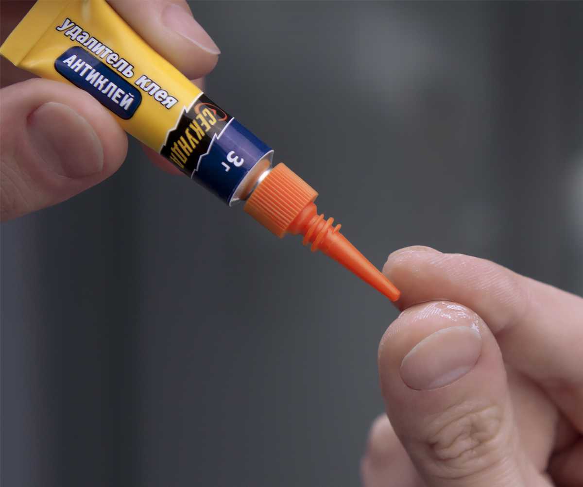 При неаккуратной работе моментальный клей может попасть не только на склеиваемые поверхности, но и на кожу рук, и окружающие предметы. В доме у предусмотрительных хозяев есть специальный раствор для удаления остатков клея («Антиклей»). Это средство эффективно растворяет вещество и используется для очистки самых разных поверхностей. Его достаточно нанести на проблемную область, выждать положенное время и вытереть остатки.