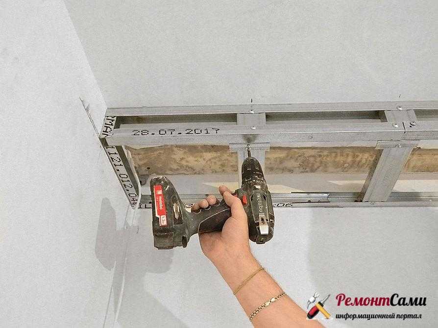 Для того, чтобы профиль можно было соединить в каркас, нужно иметь прямой подвес или воспользоваться универсальным соединителем. Процесс скручивания производится при помощи маленьких саморезов-блошек, у которых на конце есть сверло. Кроме этого, используются специальные саморезы по металлу, которые имеют потайную головку. Чтобы каркас закрепить к стене, не обойтись без пластиковых дюбелей и ударных самоерзов.