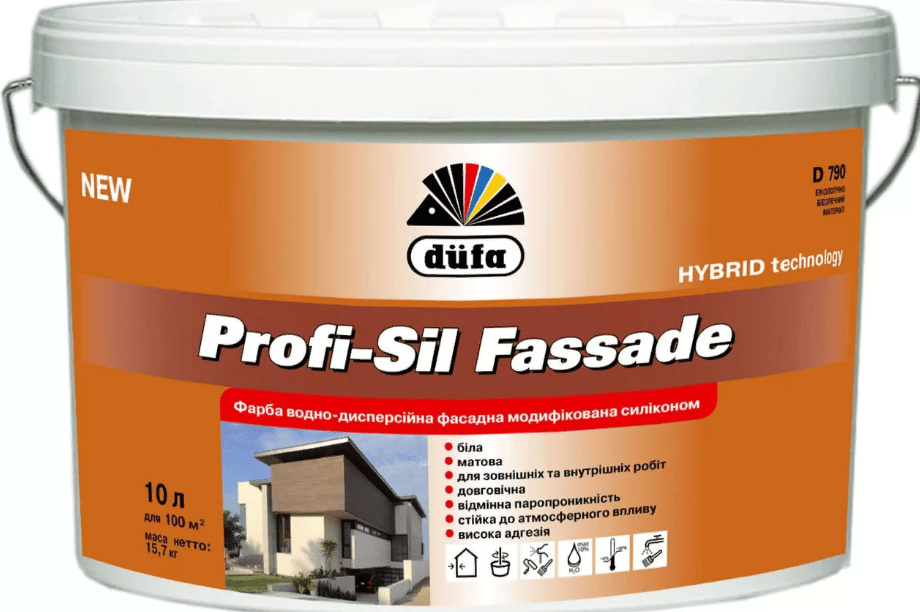 - Profi-Sil Fassade Dufa (Германия). Краска формирует прочное воздухопроницаемое покрытие. Ее расход – 0,18 кг на 1 м².