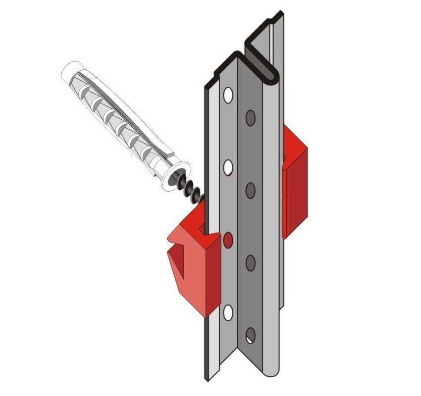 - Рядом с потолком и полом с обеих сторон просверливаются отверстия. Вверху в них вставляются дюбели с размером отступа в 5 см, а внизу монтируются фиксаторы для отвесов.