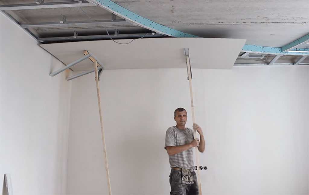 Когда отделывается потолок, мастеру очень сложно справиться с работой. Поднятие хрупких и громоздких листов к потолку и удержание их на высоте – задача непростая.