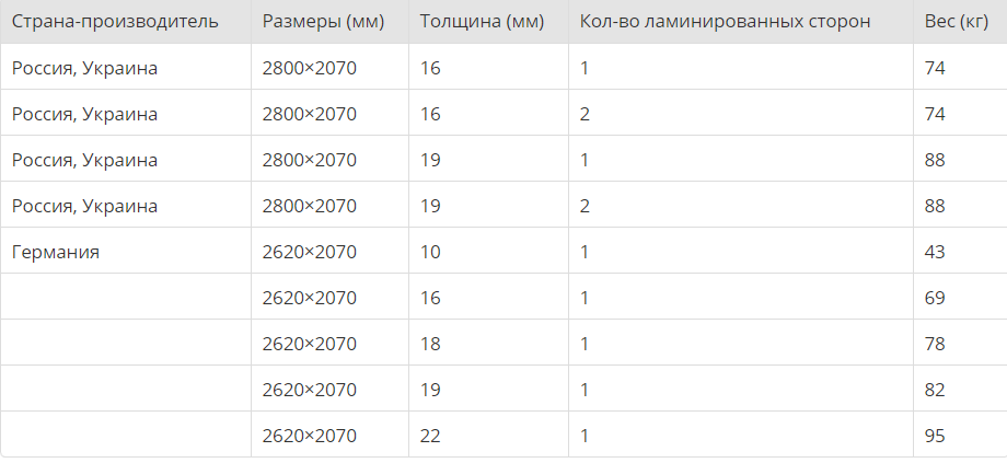 | Страна-производитель | Размеры (мм) | Толщина (мм) | Кол-во ламинированных сторон | Вес (кг) |