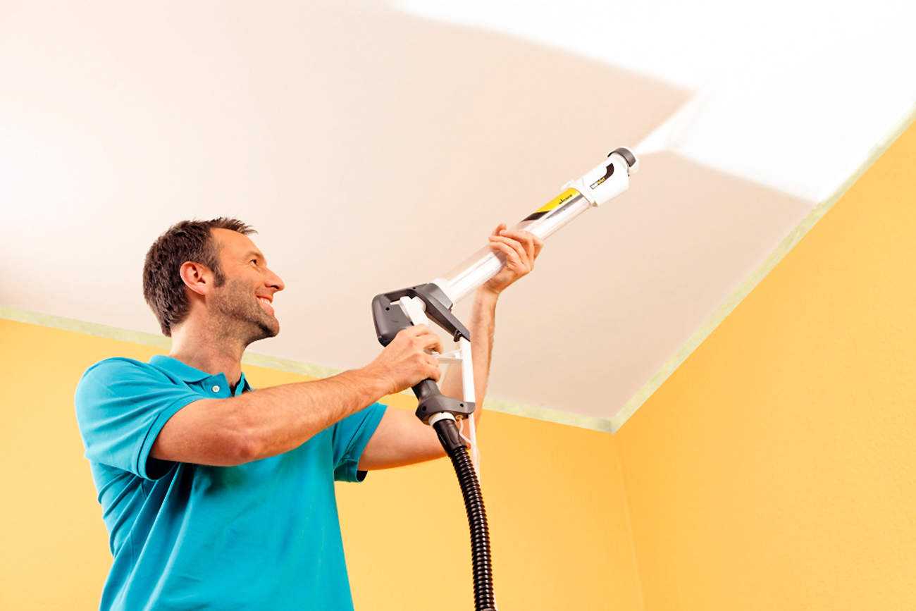 Поливинилацетатная основа подходит для покраски потолка из пульверизатора. В народе она больше известна как «водоэмульсионка», в свое время это была хорошая альтернатива побелке. Ее связующий компонент во многом напоминает строительный клей ПВА. Она хорошо смывается в сыром виде, пока не завершится процесс полимеризации. Для стен она не подходит – прислонившись, можно уйти с пятном на одежде, подобным меловому отпечатку.