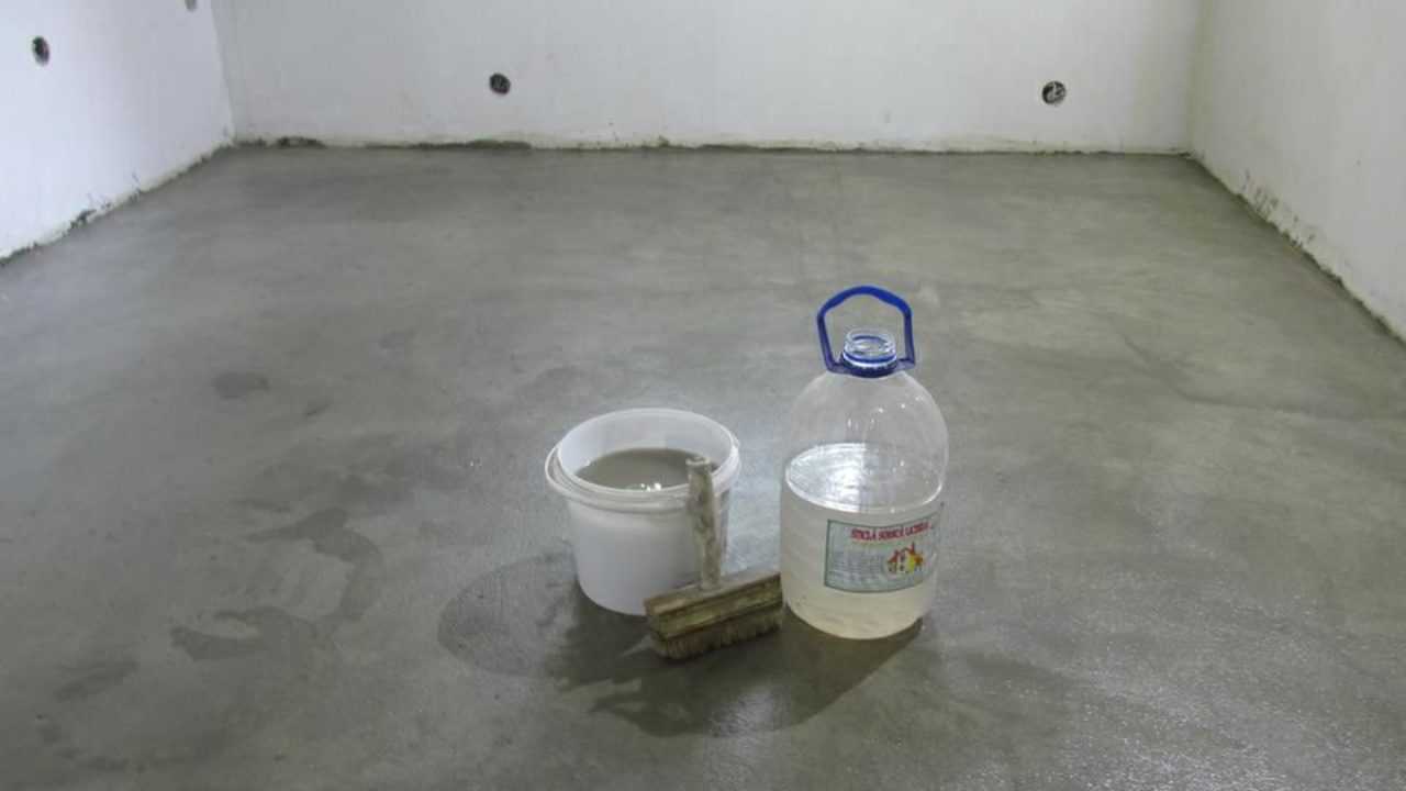 - Связывание пыли и мелкодисперсных частиц. Жидкое стекло может быть применено для грунтования бетонной стяжки. Водный раствор состава проникает в структуру бетона на глубину от 3 до 5 мм, после чего происходит его полимеризация. Застывший силикатный состав не только значительно увеличивает гидрофобность стяжки, но и связывает пыль и мелкодисперсные абразивные частицы.