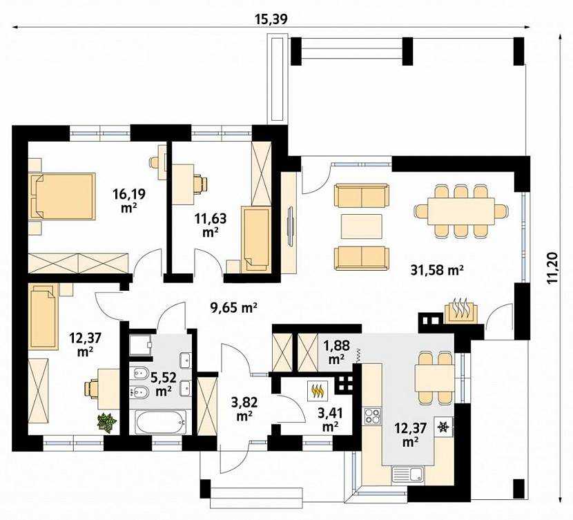 Данный проект – наиболее экономичный, уютный и компактный. Тут есть тамбур, который защищает внутреннее пространство от пыли и сквозняков с улицы. Все спальные помещения объединены в левой части здания, а правое крыло отдано под зону общего назначения. Кухня и вся рабочая зона подсвечена окном в углу. Гостиная с камином имеет выход на компактный балкон или небольшую террасу.