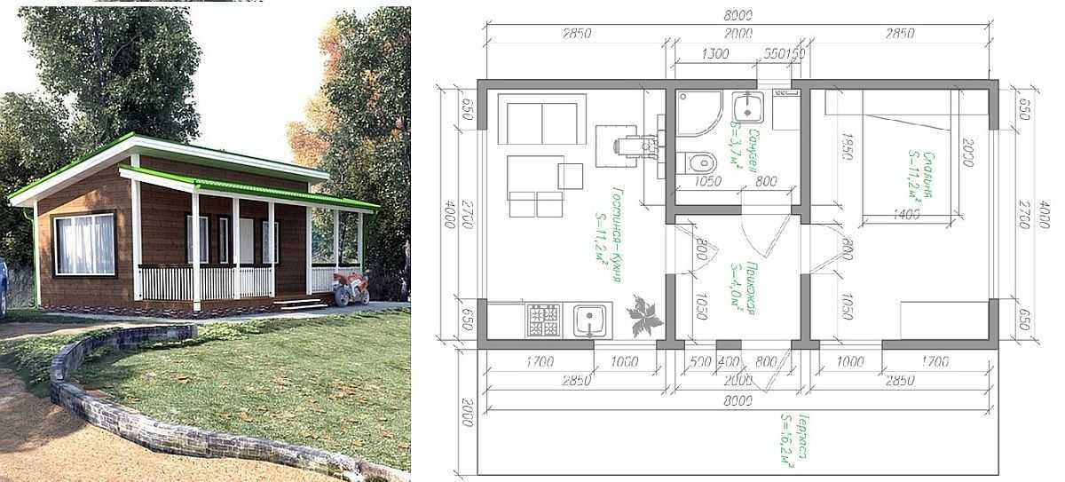 Проект маленького дачного дома с верандой под общей крышей