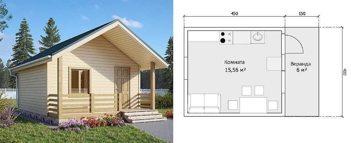 Еще один вариант — одна комната, в которой отведено место под несколько кухонных шкафчиков и плиту, стоит небольшой обеденный стол и есть спальное место. Такая планировка идеальна для проживания одного человека. Неплохо в ней себя будут чувствовать двое. В данном варианте санузла нет, так что придется строить туалет отдельно.