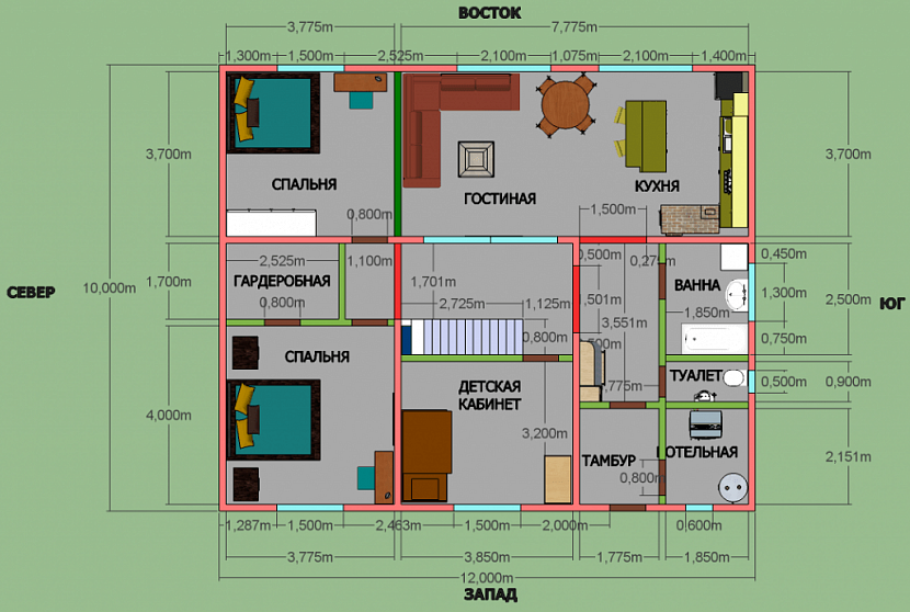 - детскую комнату или помещения для гостей стоит расположить в юго-восточной или южной стороне дома.