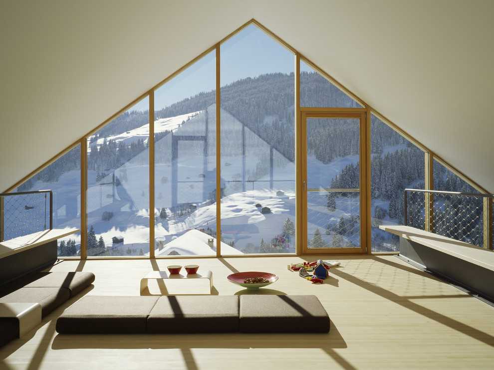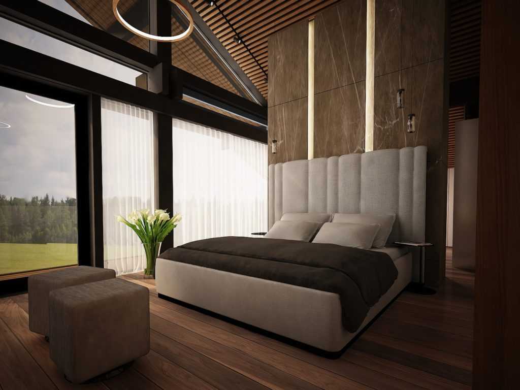Эффект современности добавляют панорамные окна в пол. Прозрачность – еще один важный элемент такого стиля. Он позволяет не только придать еще большей загадочности этому стилю, но и улучшить освещение в помещении.