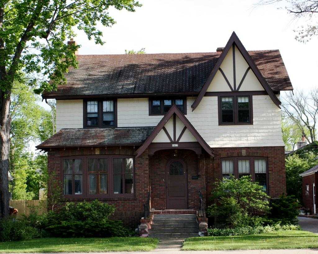 Что касается фасада дома, то его штукатурят, а уже потом обкладывают красивейшим кирпичом или камнем. Такой украшение, особенно в дуэте с широкими окнами, показывает очень сильное отличие от домов классического стиля.
