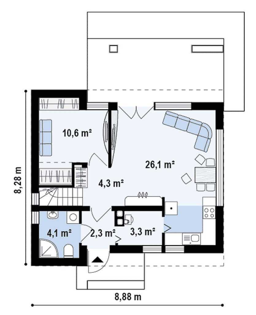 Небольшой компактный одноэтажный домик с дополнительным мансардным жилым пространством. Стены отделаны газоблоками, благодаря чему внутри здания всегда будет сохраняться нужная температура (зимой – тепло, летом – прохладно). Пол первого этажа покрыт монолитной плиткой, а межэтажное перекрытие сделано с помощью деревянных балок. Крыша необычная, многокаскадная, что придает дому специфический внешний вид, смотрится красиво и современно. На первом этаже, на входе в коттедж, находится некий маленький тамбур, где чаще всего располагаются шкафы для верхней одежды и обуви. Из тамбура имеется 2 выхода:
