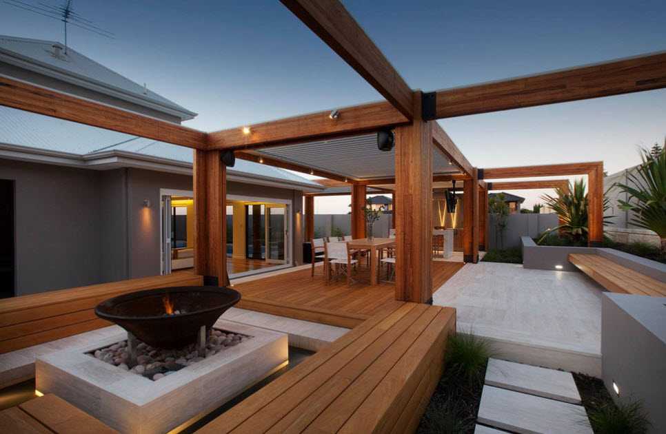 Встречаются комбинированные террасы, что совмещены с беседкой или перголами. Проект дополняется искусственным водоемом, клумбой. Все зависит от желания заказчика. Какой же отдых обойдется без жареного мяса или овощей на гриле? Для этой цели на террасе делается зона барбекю. Так как печь довольно тяжелая, а огонь может негативно сказаться на материалах из дерева, эта зона отделяется от основной и для нее создается прочный фундамент.