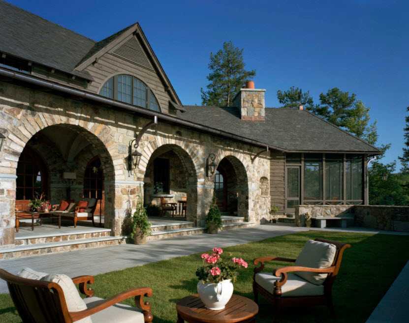 Дизайнеры считают, что дом с террасой – отличное решение, позволяющее увеличить общее пространство дома и придающее даже скромному дачному домику особый шарм и уют. Чаще всего террасу размещают под крышей, но встречаются варианты без крыши, состоящие только из настила и ограждения из дерева или камня.