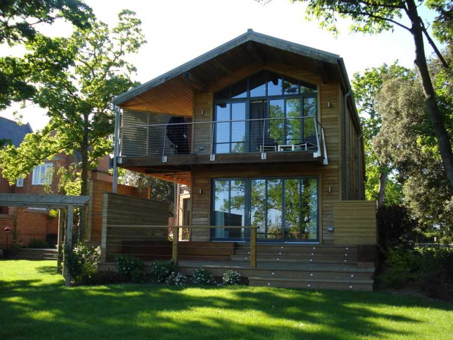 На фото дома с панорамными окнами виден двухэтажный коттедж с оригинальной планировкой. Их установка делает окружающий дизайн особенным, расширяет границы. С мансардного этажа можно наблюдать за окружающей красотой.