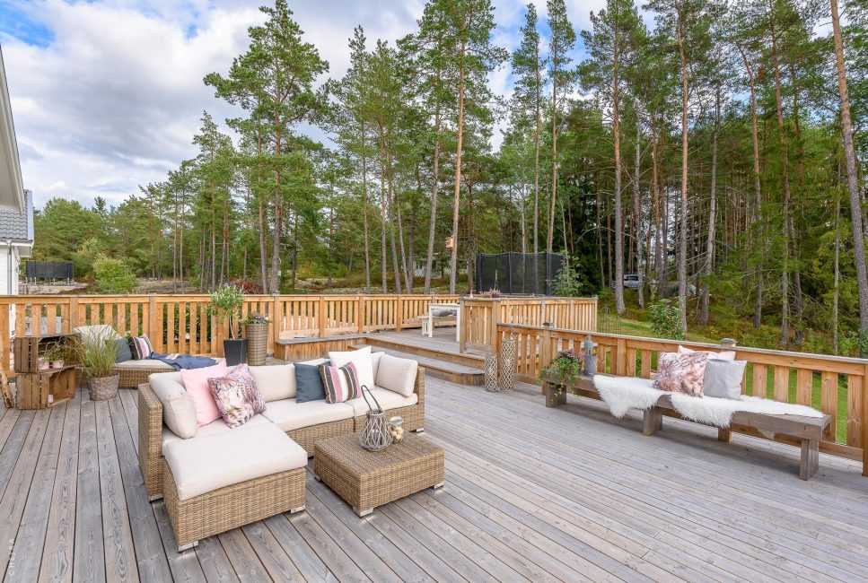 Выход лучше организовать из столовой или гостиной. Не стоит объединять террасу со спальнями. Открытая площадка располагается с противоположной стороны от основного входа. Владельцам маленьких участков нужно организовать живую изгородь или другое декорирование. Это поможет спрятать свою жизнь от посторонних глаз соседей.
