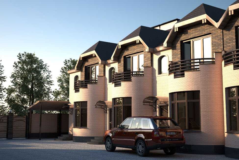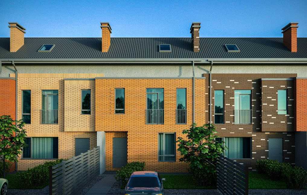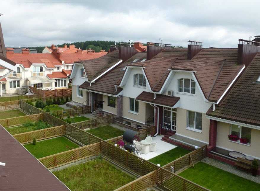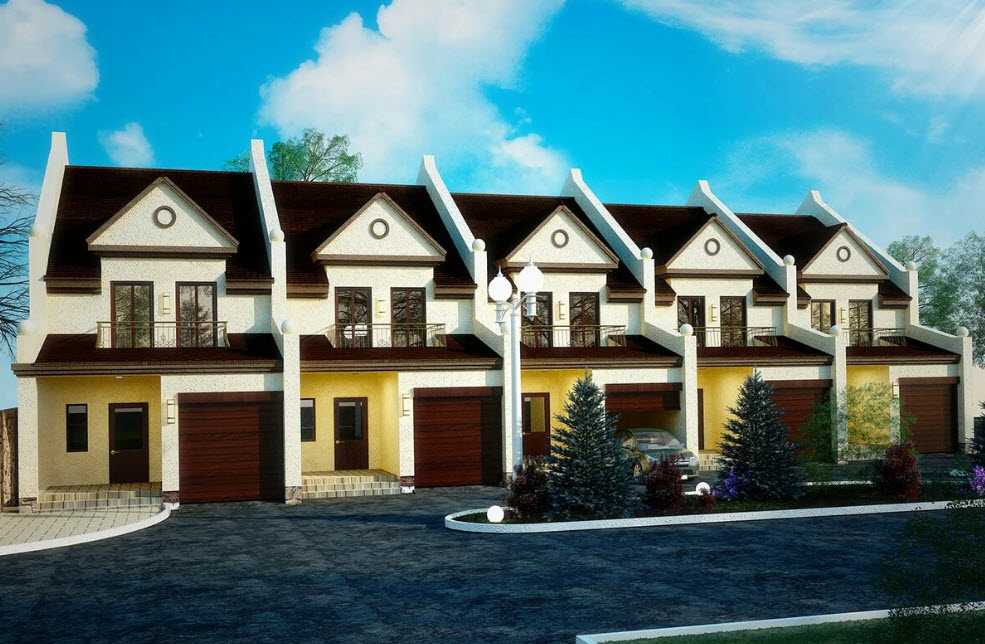 Каждый таунхаус включает в себя от двух до 10 секций. Одна такая секция рассчитана на проживание одной семьи. Стоит заметить, что возводятся дома на земельных участках площадью 2-5 соток, которые уже приватизированы. Зачастую вход выполнен со стороны улицы, а на придомовом участке располагается гараж и другие хозпостройки.