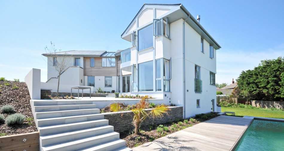 Материал применяют в проектах современной архитектуры – минимализм, хай-тек, индустриальный стиль – где важно акцентировать внимание на простых формах и линиях, а от фасадного декора можно отказаться. Серые бетонные стены можно оставить без отделки, тогда усилится эффект мощного, основательного сооружения. Придать ему визуальную легкость можно панорамным остеклением, как на фото